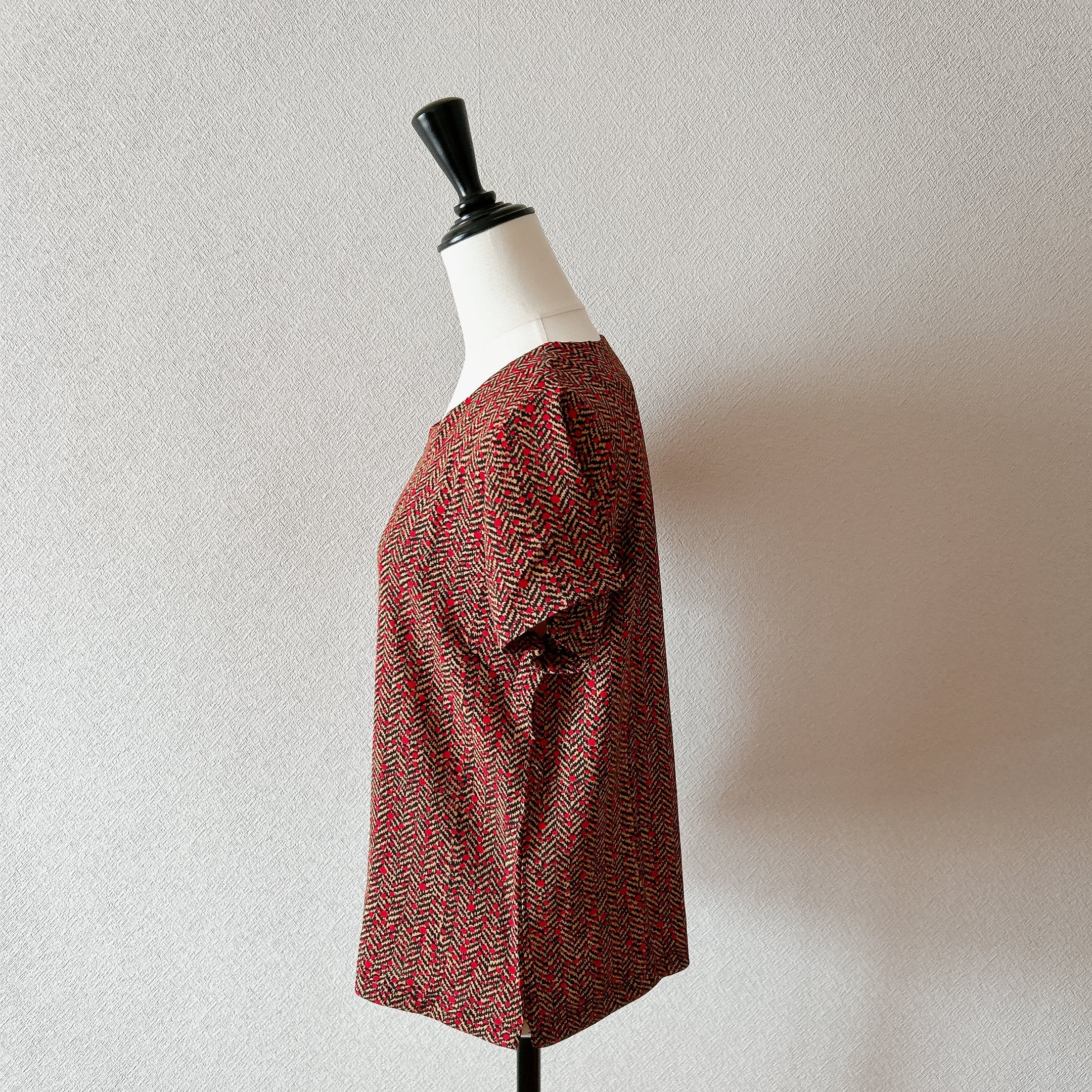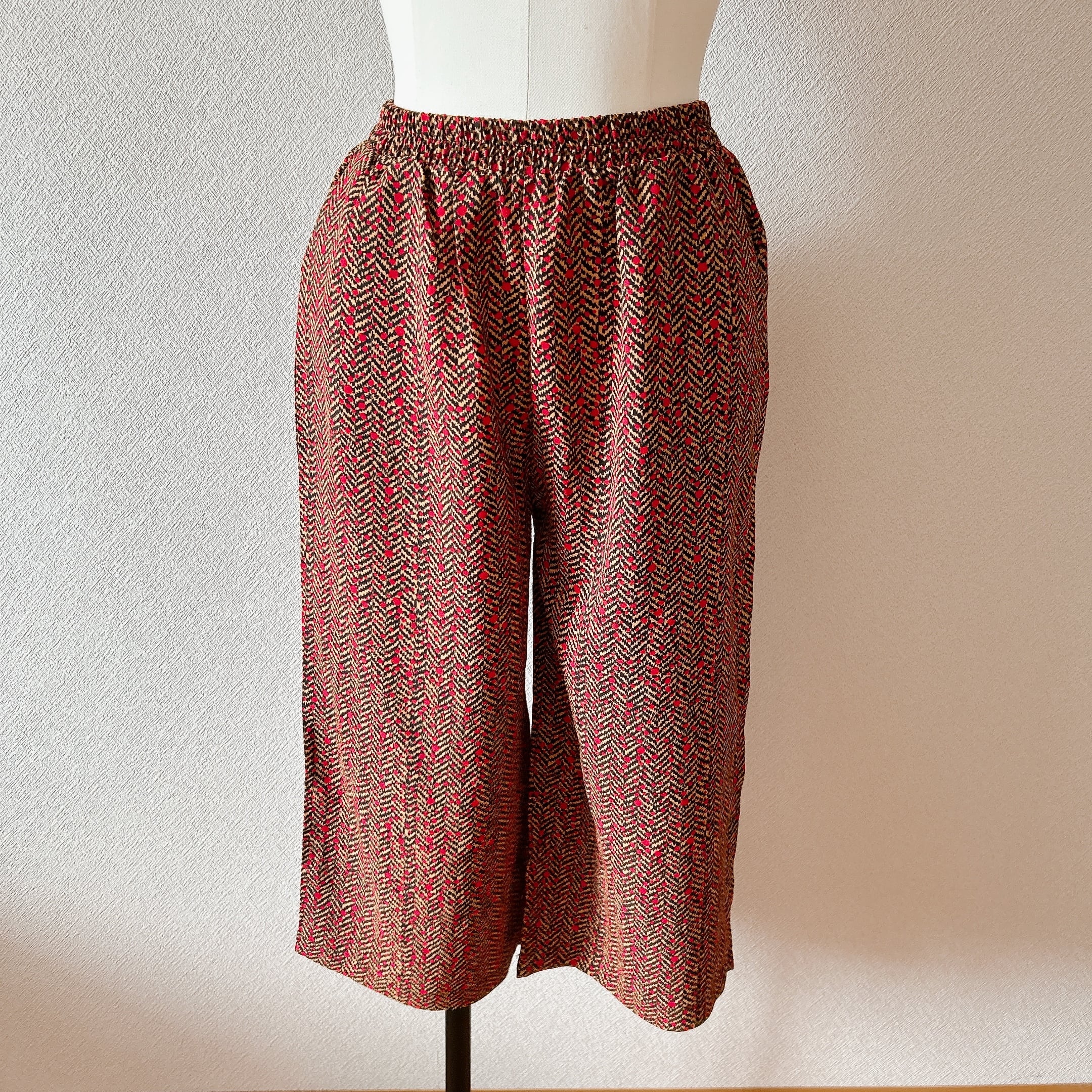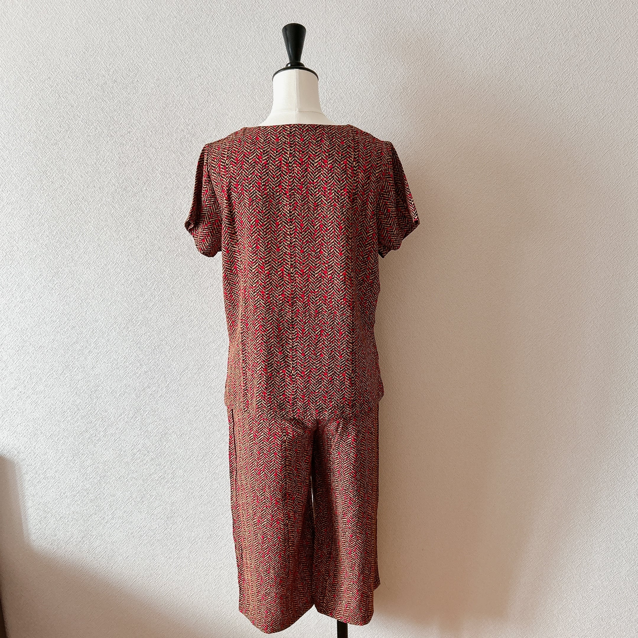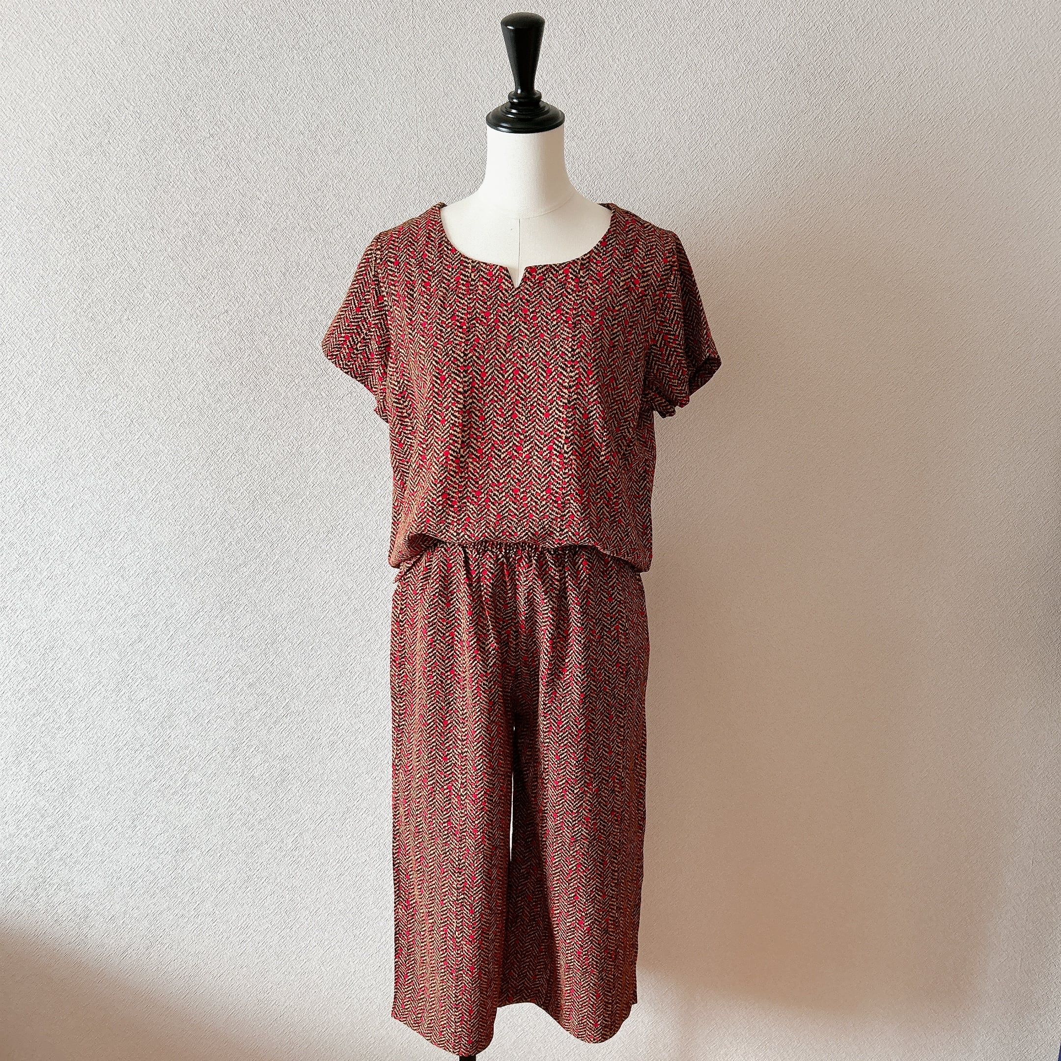 ベトナム製の「ラインモザイク柄半袖上下セット」は、シックなワイン色が素敵なラインモザイク柄が魅力のアイテムです。しっかりめの生地を使用しているため、快適な着心地を実現します。半袖のスキッパーデザインはカジュアルでありながらも洗練された印象を与え、幅広いシーンで活躍します。